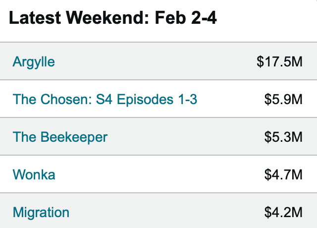 In box office news… Argylle, directed by Matthew Vaughn, known for Kick-Ass and the Kingsman franchise, and starring Henry Cavill, Bryce Dallas Howard, and Sam Rockwell, was released this past Friday. The cast is star-studded, also including Bryan Cranston, Dua Lipa, John Cena, Sofia Boutella, and Samuel L. Jackson. With the cast and Matthew Vaughn’s many other box office successes, this movie has all the makings to have a successful run in theaters. Despite this, the movie had a disappointing opening, only doing about $18 million over the weekend.