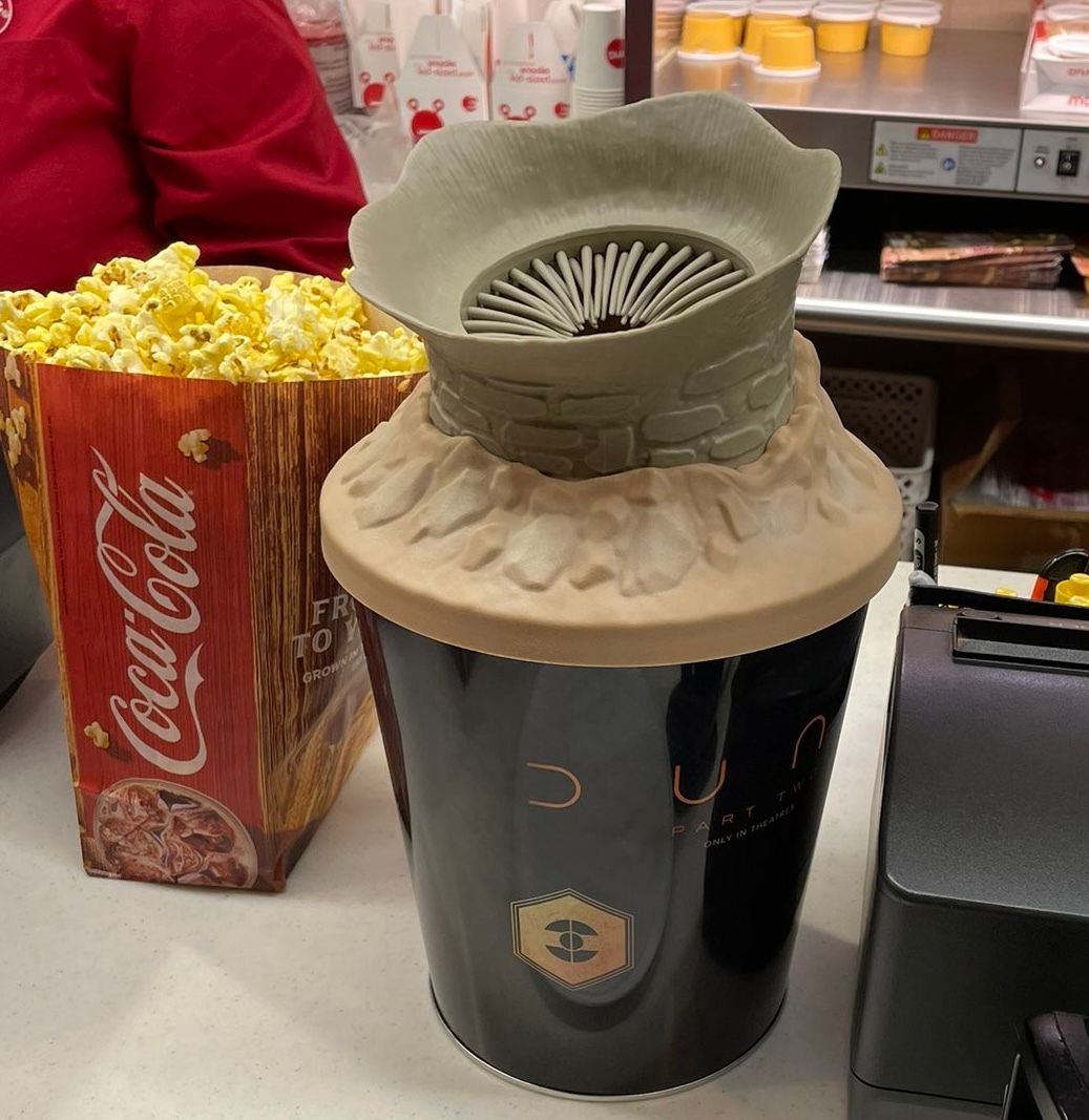 The other topic of much discussion this past week is the impending arrival of Denis Villeneuve’s DUNE: Part 2. The star of the conversation? The promotional Dune 2 popcorn bucket;