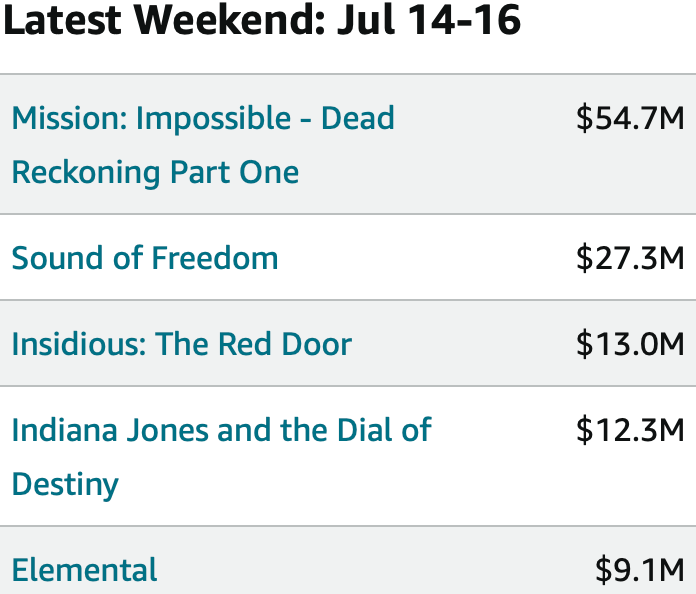 As excited as we are about this weekend, we can’t let it overshadow all the other killer stuff that’s going on at the box office. Mission: Impossible - Dead Reckoning Part One dropped last weekend to rave reviews. Our own Michaela Burton loved it and it unsurprisingly took the top position at the box office. In total, it’s done $264 million worldwide with $95 million of that being domestically. The budget was $291 million, so it will have to keep up the momentum, but we think it’ll be a big success for Tom Cruise and we’re looking forward to Part Two. We’ll keep you posted on its performance as long as your subscribed here :)